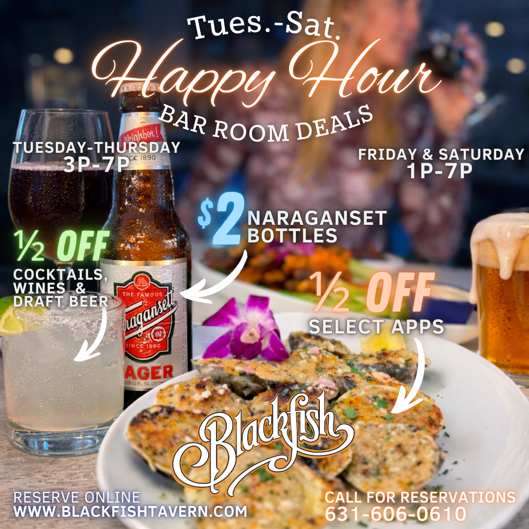 Happy Hour happens every day at Blackfish Tavern—noon to 6pm at the bar. Unwind with great drinks, great bites, and that local Northport vibe. Grab a seat, catch the game, meet friends, and toast the day with house specials and bar-only favorites.